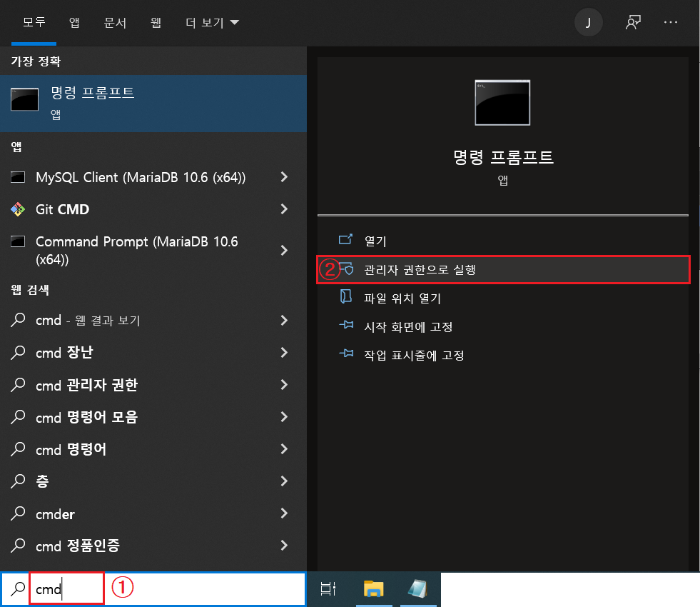 윈도우 검색창에 'cmd' 검색한 뒤