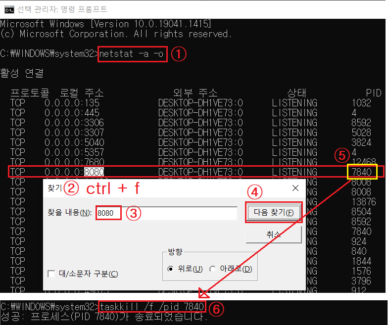 1. "netstat -a -o" 를 입력하고 엔터 누릅니다.