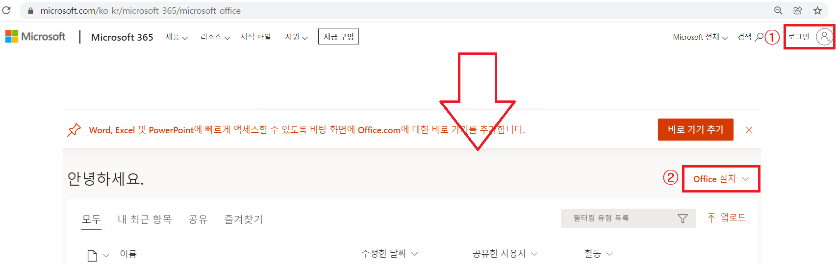 로그인 후 "Office 설치" 버튼을 클릭하여 다운로드 합니다.